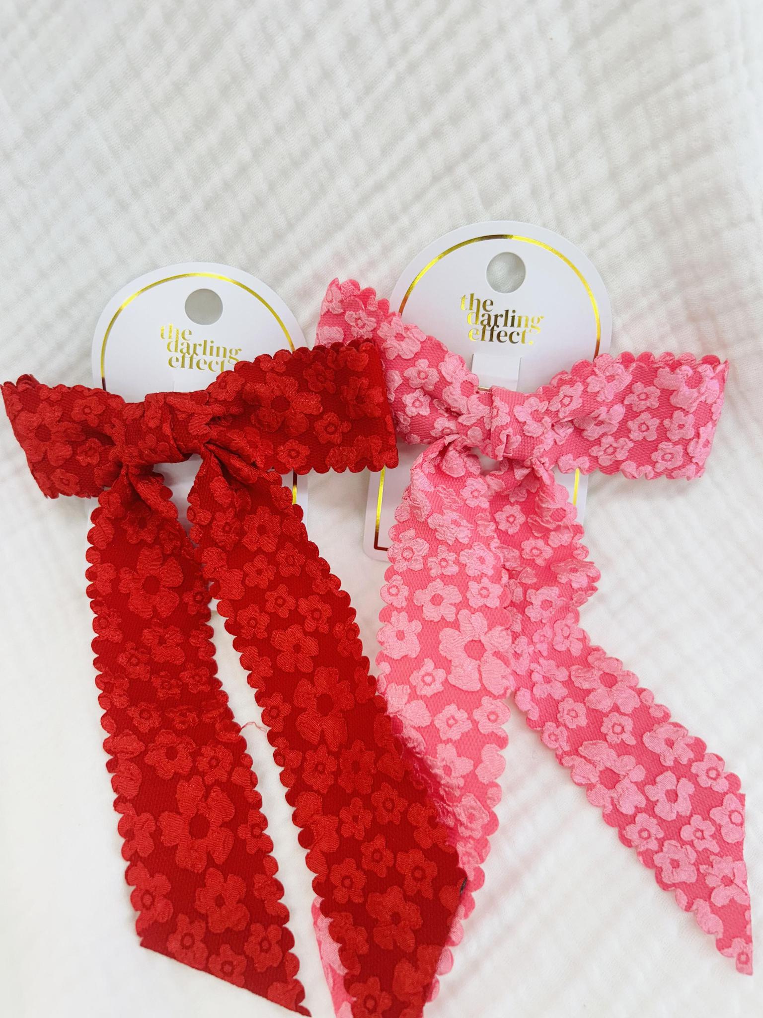 Beautiful red and pink floral hair bows that add a sweet, feminine pop of color to any Valentine-inspired look.
