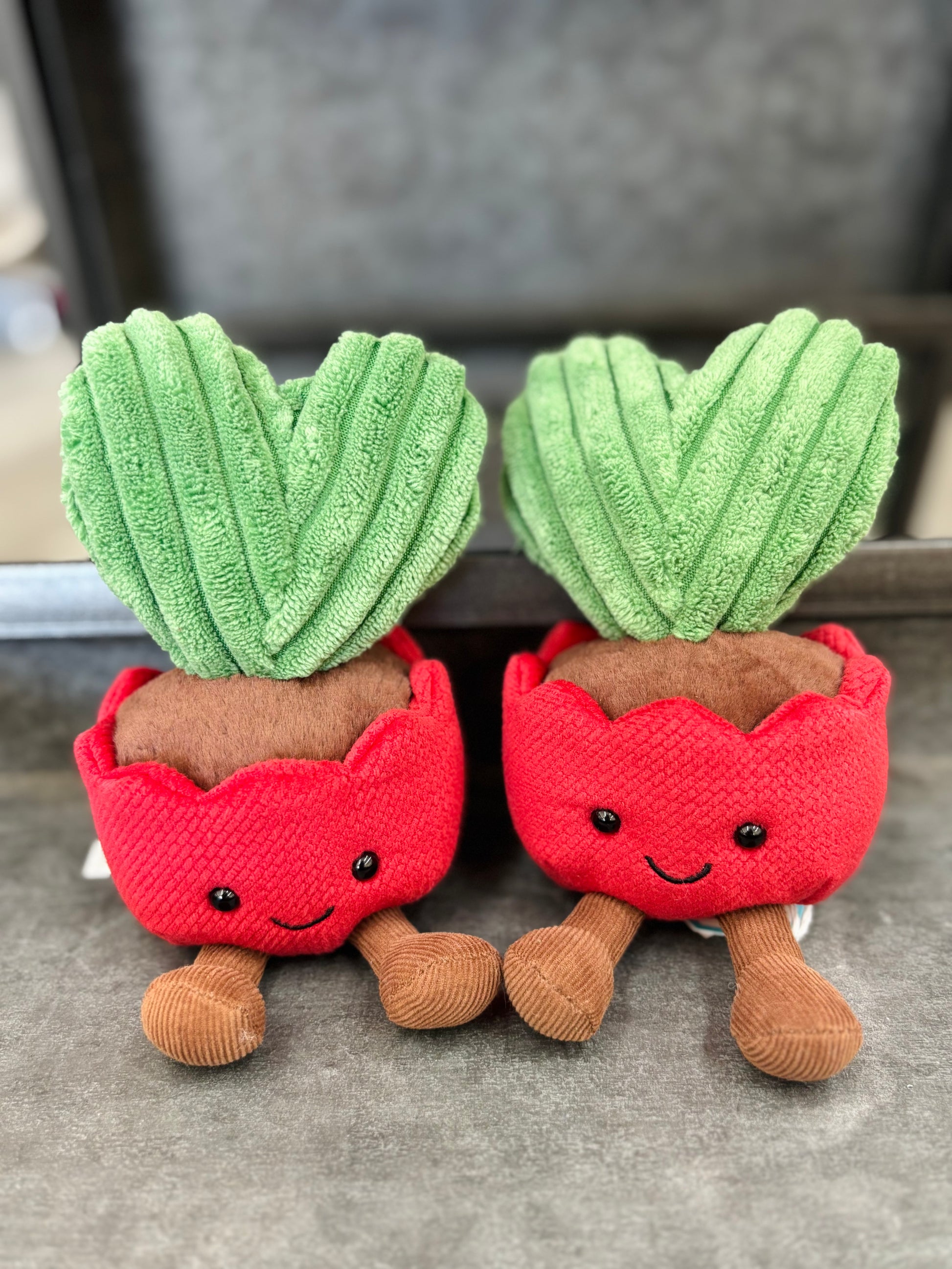 Amuseables Kerrii Cactus is the luckiest of lucky hearts. A green, cordy heart-shaped leaf is nestled in textured brown soil. A smiling red pot with a scallop trim, and cocoa cordy legs.